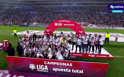 Universitario Femenino celebrates their championship win in the Liga Apuesta Total, with confetti and cheers on the field.