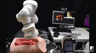 A serial robot with EPM and RCE components, controlled via a GUI and joystick, demonstrates healthcare technology.