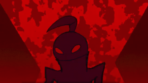 A dark, shadowy monster by Joel G with sharp teeth and multiple limbs raises its hands against a red background.