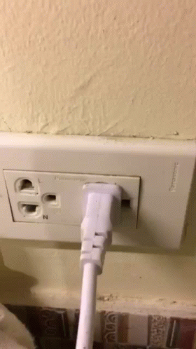 A white electrical cord is unplugged from a Panasonic wall outlet.