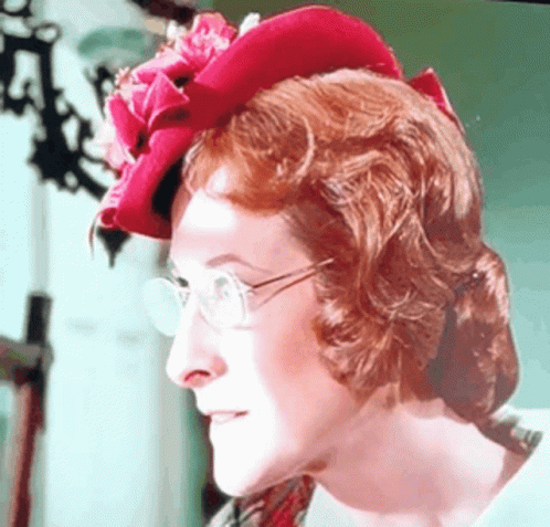 A woman with red hair, wearing a red hat with flowers and round glasses, looking thoughtful.