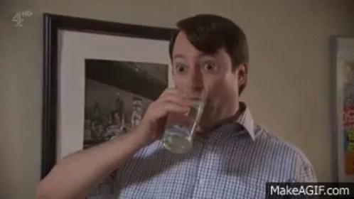 Man from Uo G University of Gloucestershire reacts with wide eyes and an open mouth after drinking water.
