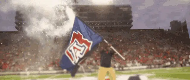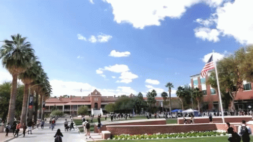 Students and people walking on the University of Arizona campus under clear skies, with the American flag flying.