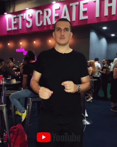 A man at CCXP creates a funny illusion of having four hands, all pointing upwards in a lively event space.