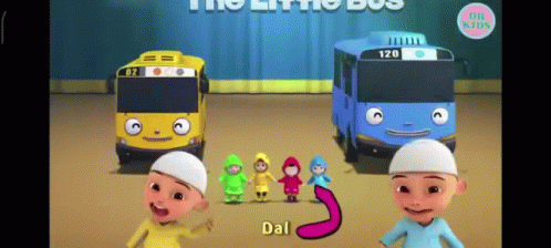 Upin and Ipin dance with Tayo the Little Bus characters, learning Arabic letters in a fun animated video.