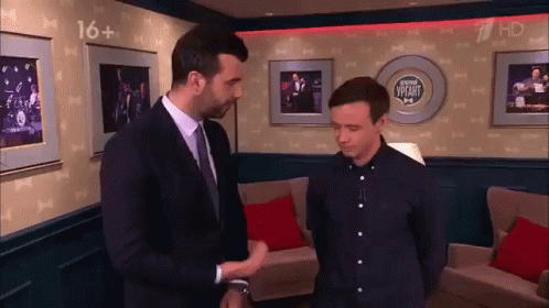Ivan Urgant and Dolphin shake hands on the set of Evening Urgant, agreeing with a 'yes' and 'excellent'.