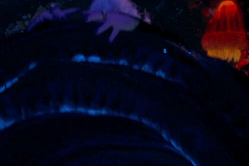 Melissa McCarthy as Ursula, the sea witch, performing in a dark, aquatic setting with glowing jellyfish.