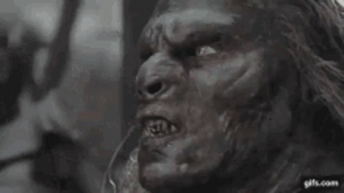 Two Uruk-hai or Orcs in a black and white scene discuss a smell, identifying it as 'Manflesh'.
