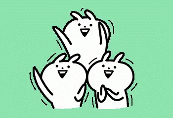 Three happy Usagyuuun characters are stacked on top of each other, waving and smiling cheerfully.