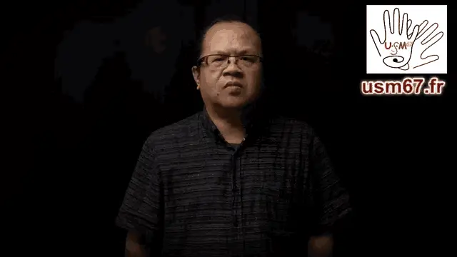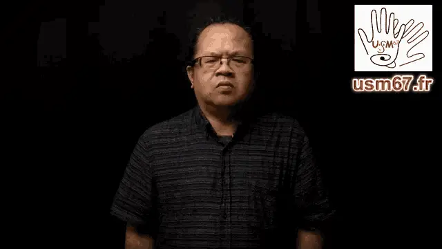 A man demonstrates the French Sign Language (LSF) phrase 'Stop bothering me' with a sign language alphabet background.