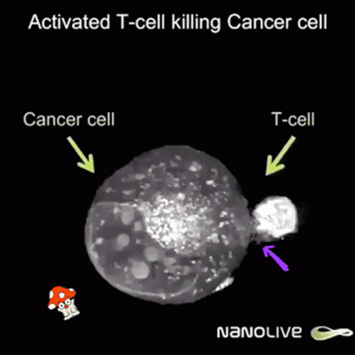 An activated T-cell engages and kills a cancer cell in a microscopic view, demonstrating cellular immunotherapy.