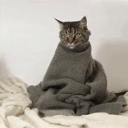 A cozy cat wrapped in a grey blanket on a bed, then a person attempts to dress it in a blue garment.