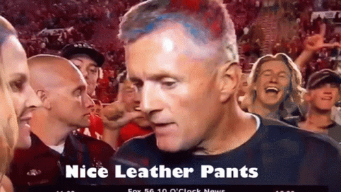 Utah Football coach Kyle Whittingham is interviewed amidst cheering fans, with the humorous caption 'Nice Leather Pants' displayed.