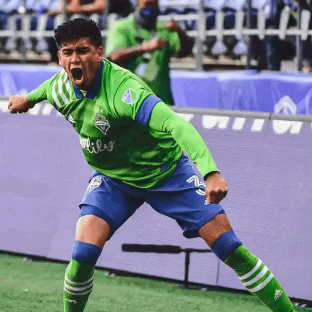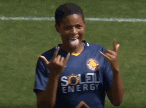 Tziarra King of Utah Royals FC makes a funny face with her tongue out and a rock on gesture while wearing her Soleil Energy jersey.