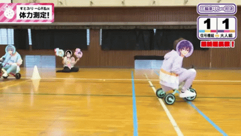 Utaite group Sutopuri members, including Colon and Nanamori, compete in a tricycle relay race during a physical fitness test.