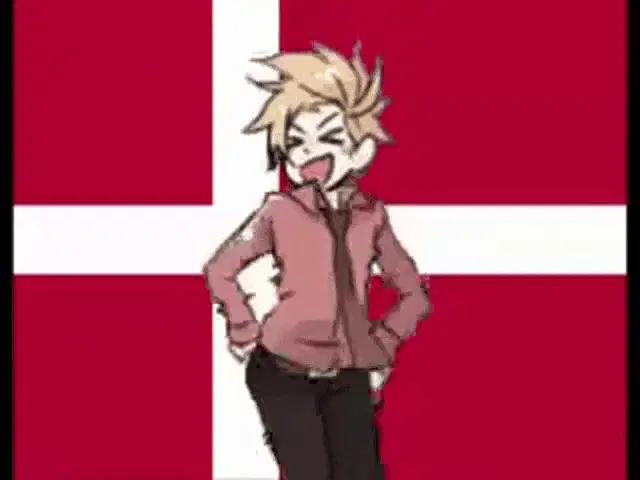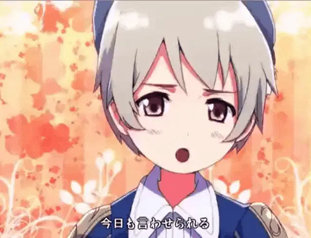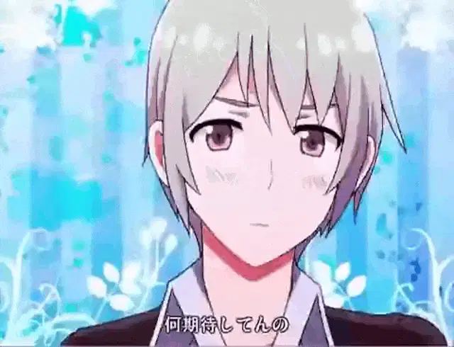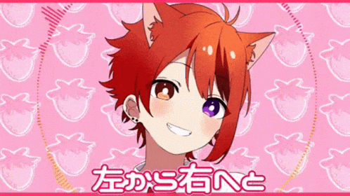 Sutopuri's Riinu, a boy with cat ears, smiles in front of a pink background with strawberries.