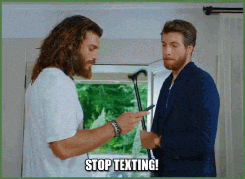 Utku Ates and Can Yaman from Erkenci Kus with a cane, humorously telling someone to stop texting.