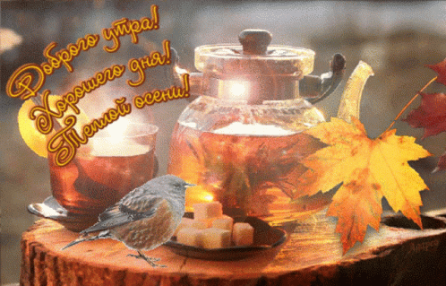 A small bird sits next to a teapot and cup of tea, surrounded by autumn leaves.