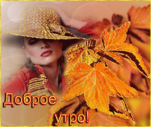 Woman in a straw hat surrounded by autumn leaves, wishing 'Good morning!' in Russian.