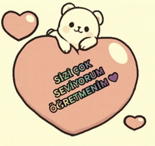 A cute cartoon teddy bear peeking over a pink heart with the message 'I love you very much, my teacher'.