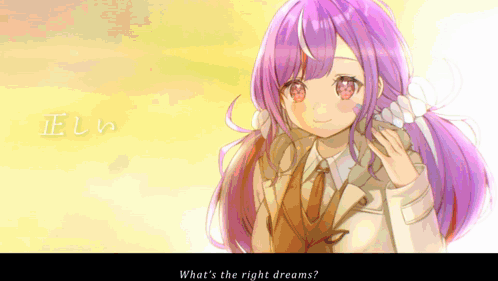 a girl with purple hair is holding a flower and the words what 's the right dreams are below her