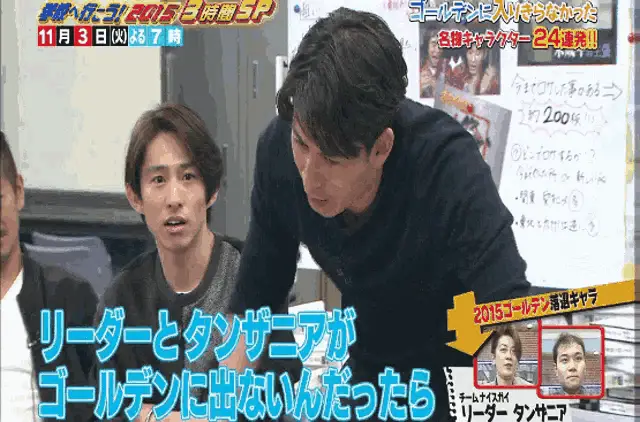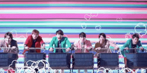 Japanese boy band V6 members express excitement while riding a colorful roller coaster against a vibrant striped background.
