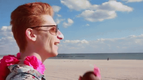 Vacation Jason (Chris Gethard) enjoys a tropical drink on a sunny beach, wearing sunglasses and a flower lei.
