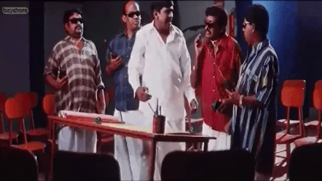 Vadivelu, the famous comedian, laughing heartily while dressed as a police officer with a mustache and blue hat.