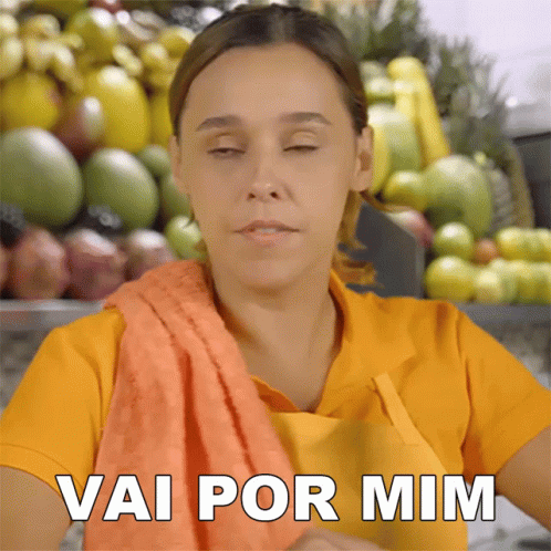Thati Lopes from Porta Dos Fundos with the caption 'Vai Por Mim' in a fruit stand setting.