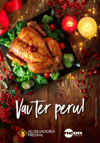 Christmas ad featuring a roasted turkey, festive decor, and branding for Auxiliadora Predial and Neon Imóveis.