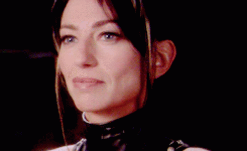 Claudia Black as Vala Mal Doran from Stargate SG-1, smiling with her signature dark hair.
