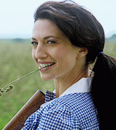 Vala Mal Doran (Claudia Black) from Stargate SG-1, smiling with a shotgun and a blade of grass.