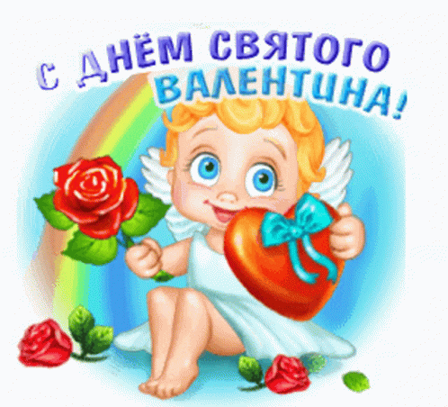 A cute cupid holds a rose and heart, wishing 'Happy Valentine's Day' in Russian.