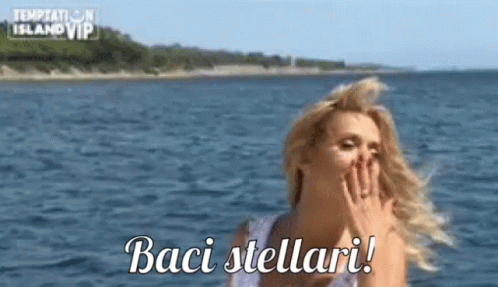 Valeria Marini on Temptation Island VIP, blowing 'Baci Stellari' (Stellar Kisses) from a boat.