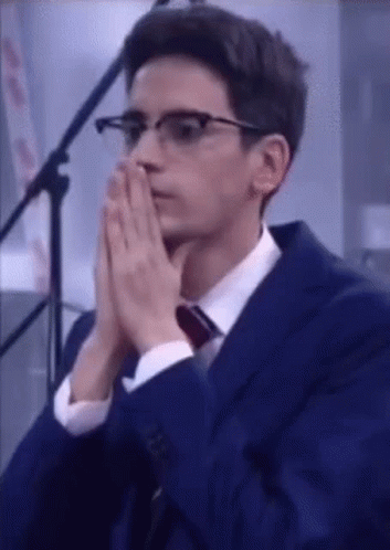 Valerio Lundini in a suit, making a thoughtful gesture with hands clasped, with 'No Vabbè' caption.