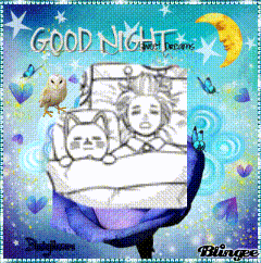 Vamola Dandadan good night greeting card featuring a person and a cat sleeping in bed, with stars and a moon.