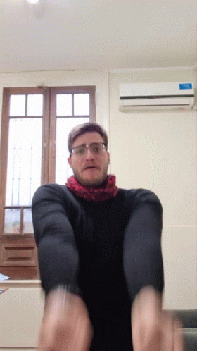Guido enthusiastically shouts and pumps his fists, wearing glasses and a red scarf.