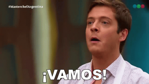 Gaston Dalmau celebrates with an enthusiastic '¡Vamos!' on Masterchef Argentina, raising his arms in excitement.