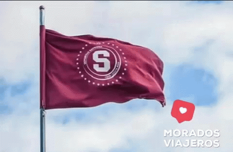 The Saprissa flag, representing Morados Viajeros, waves proudly under a cloudy sky.