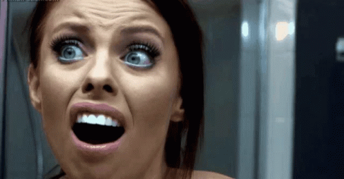 A girl's face transforms into a vampire with sharp fangs and dark, wide eyes, showing a surprised expression.