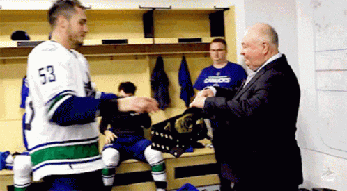 Bo Horvat of the Vancouver Canucks receives a championship belt in the locker room after a game.