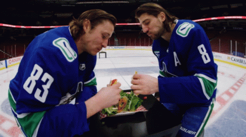 Vancouver Canucks players Chris Tanev and Jay Beagle attempt to eat a massive taco on the hockey rink.