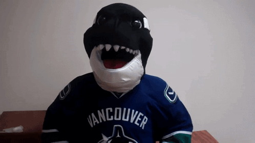 Vancouver Canucks mascot Fin The Whale energetically dances and cheers in his team jersey.