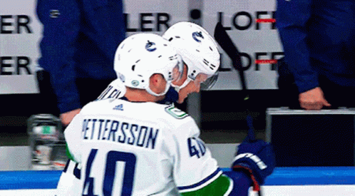 Vancouver Canucks hockey players high-five and celebrate on the bench after a win.