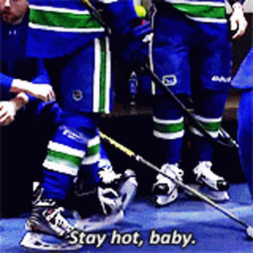 Vancouver Canucks hockey players in the locker room, one player tells another to 'Stay hot, baby'.