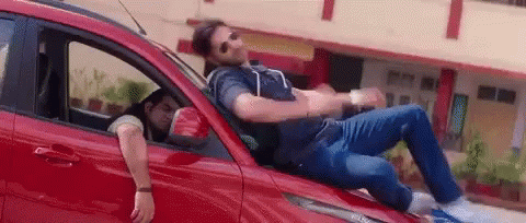 Varun Dhawan sits casually on the hood of a red car, with another person visible inside the vehicle.