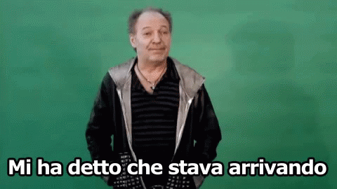 A man on a green screen says 'Mi ha detto che stava arrivando' in anticipation of Vasco Rossi.