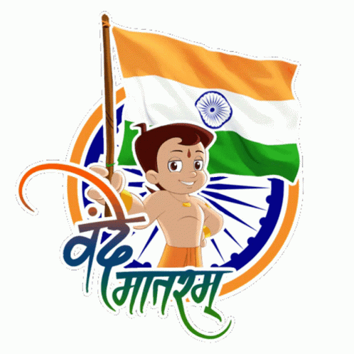 Chhota Bheem proudly holds the Indian flag, with the patriotic slogan "Vande Mataram" displayed.