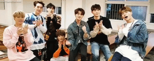 K-pop group Vav enthusiastically clapping and posing for the camera in an indoor setting.