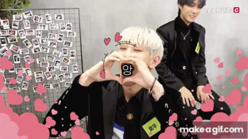 VAV member Lou, with blonde hair, makes a heart gesture with his hands, surrounded by animated pink hearts.